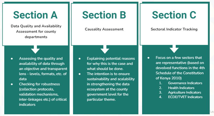 It is important to note that Data Maturity collection and indexing is not about highlighting the state of health of sectoral performance of individual counties. We are rather looking to assess the state of data that is currently being collected and the data practices that accompany them.