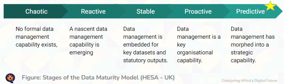 Data maturity measures the extent to which an organisation uses their data. Assessing the level of data maturity in an organisation involves looking at how data is collected, stored, analysed and used for decision making and innovation.